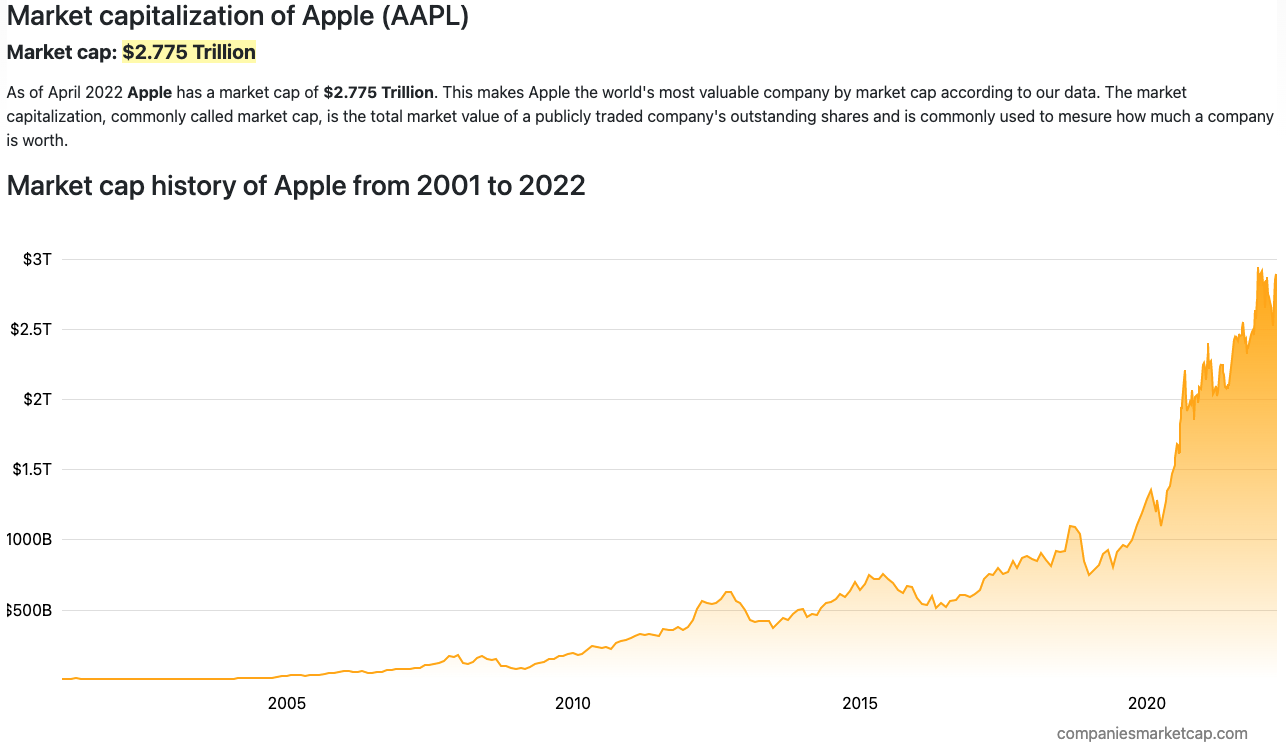 세계에서 가장 유명한 브랜드인 애플입니다. 2001년 닷컴버블이 한창일 때 상장한 이 회사는 한 때 파산 위기도 겪었지만 2008년 스티브 잡스의 복귀 이후 아이팟, 아이폰, 아이패드 등 신제품을 연달아 히트시키며 엄청난 성장 곡선을 그리고 있습니다. 성장성에 대한 월가의 우려에도 불구하고 신제품을 출시할 때마다 기록적인 매출을 보여주는 이 회사는 전세계에서 가장 큰 회사로 마이크로소프트와 1위 자리를 다투고 있는 중입니다. 2022년 4월 현재 시가총액은 원화 약 3,200조원 입니다.