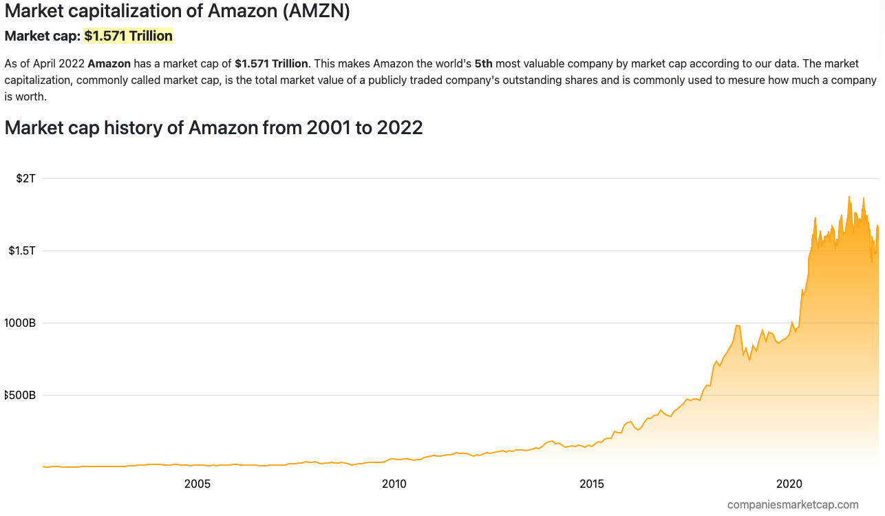 2010년대에 가장 빠르게 성장한 빅테크 기업인 아마존입니다. 애플과 마찬가지로 닷컴버블이 한창인 2001년 상장했고 이후 10년 넘게 주사업인 유통 분야에서 적자였지만, 결국 미국 온라인 유통 시장을 집어삼키고 규모의 경제를 달성했습니다. 대부분의 인터넷 서비스 회사들이 사용중인 클라우드 서비스인 Amazon Web Services 역시 2010년 이후 엄청난 성장에 기여하고 있습니다. 2022년 4월 현재 시가총액은 원화 약 1,900조원 입니다.