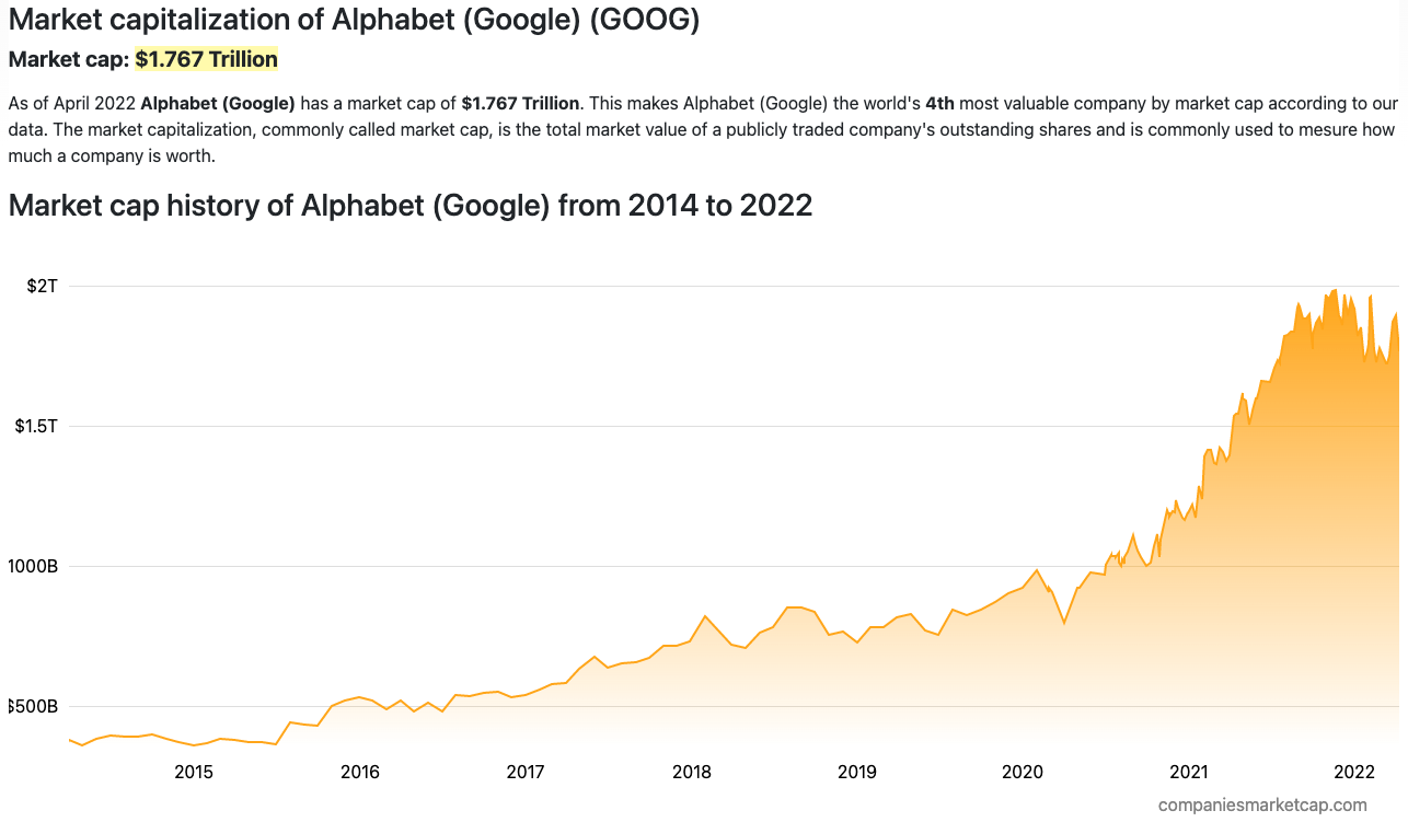인터넷 검색을 구글링과 동의어로 만들어낸 구글입니다. 일하고 싶은 직장 순위에 빠지지 않고 등장하는 구글은 최근 10년간 인터넷 사용자의 증가와 인터넷 생태계 발전을 등에 엎고 꾸준히 성장해온 회사입니다. 인터넷 광고 시장을 지배하는 구글은 광고에서 얻어낸 수익으로 클라우드, AI, 자율주행 등 다양한 신사업에 도전중이며, 주가 역시 큰 기복없이 단단한 상승 곡선을 그리고 있습니다. 2022년 4월 현재 시가총액은 원화 약 2,100조원 입니다.