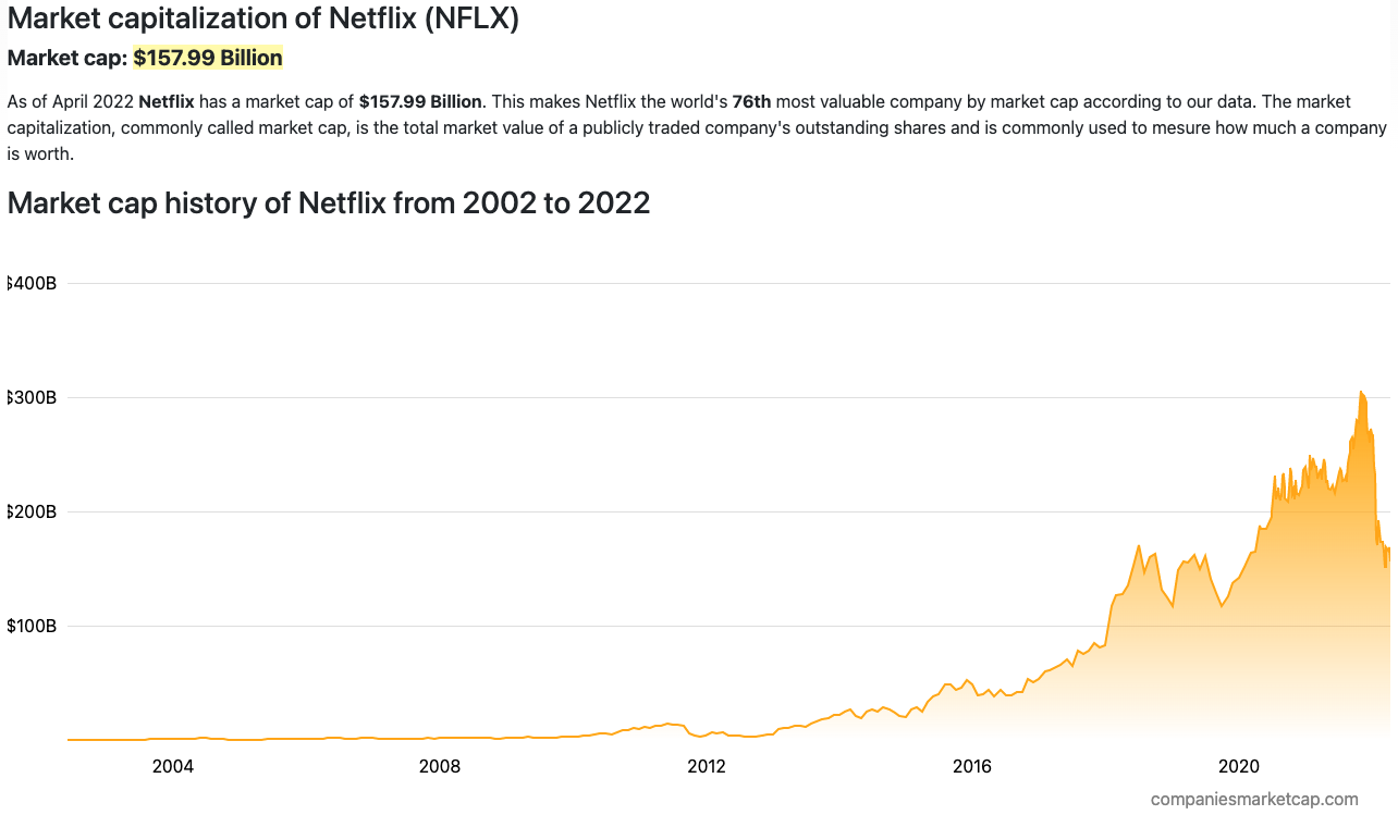 몇십년간 전세계 사람들의 여가시간을 대부분 차지하던 TV를 제치고 플랫폼 혁신을 이뤄낸 넷플릭스입니다. 온라인 DVD 대여사업으로 시작한 넷플릭스는 애플, 아마존과 비슷한 시기인 2002년 상장했지만, 인터넷 이용자수가 급격히 늘어난 2010년대에 본격적으로 큰 성장을 이뤄냈습니다. 최근 Disney+, HBO Max, Apple TV 등 경쟁자가 늘어남에 따라 주가가 하락했습니다. 2022년 4월 현재 시가총액은 원화 약 190조원 입니다.