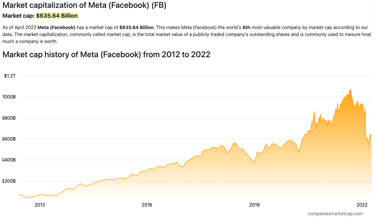 최근 사명을 바꾼 세계 최대 소셜미디어 회사인 페이스북 또는 Meta Platforms는 2013년 상장 이후 인터넷 상에서 가장 논란을 많이 일으킨 기업일 것 같습니다. 인스타그램, 왓츠앱 등 대부분 나라들의 독점적 인터넷 커뮤니케이션 플랫폼을 보유한 페이스북은 최근 애플과의 분쟁, 개인정보 보안 이슈, 사용자수 감소 등 악재로 인해 주가가 크게 하락했습니다. 하지만 1,000조가 넘는 시가총액을 달성한 최근까지 엄청난 성장을 보여줍니다. 2022년 4월 현재 시가총액은 원화 약 750조원 입니다.